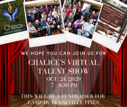Saturday, October 24 at 7 PM we will celebrate the many talents of our beloved congregation. Make sure that you have marked your calendar! As many of you likely know, our beloved Camp de Benneville Pines has been severely impacted by both Covid and the recent fires. Therefore, we decided that the Chalice Talent Show will also serve as a fundraiser for de Benneville. If you are able and willing, you can make donations at https://www.uucamp.org/contribute/covid-19-emergency-fund-2/ , or we will also have multiple ways to give during the talent show.