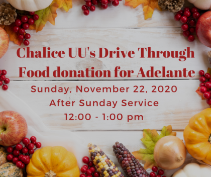 Sunday, November 22, AFTER SERVICE 12-1:30PM @ Chalice UU Sanctuary please bring your food items and (if desired) checks to the Chalice Drive Through giving and greeting celebration after our regular zoom service. I hope to see you from a distance. We will deliver our holiday offerings all together on the following Tuesday morning and there will be no volunteer pick up that week. We are so thankful for your sustained gifts though these health and economic hardships.