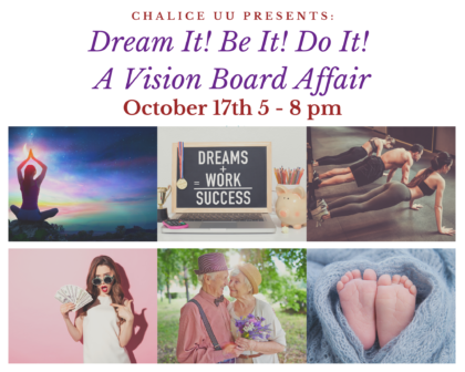 A drive thru package pick up will be held at Chalice Friday, October 16, 5-7pm. The $5 donation will go toward supplies for your vision board. For anyone who is unable to leave their home, supplies can be delivered contact-free. No one will be turned away for lack of funds!