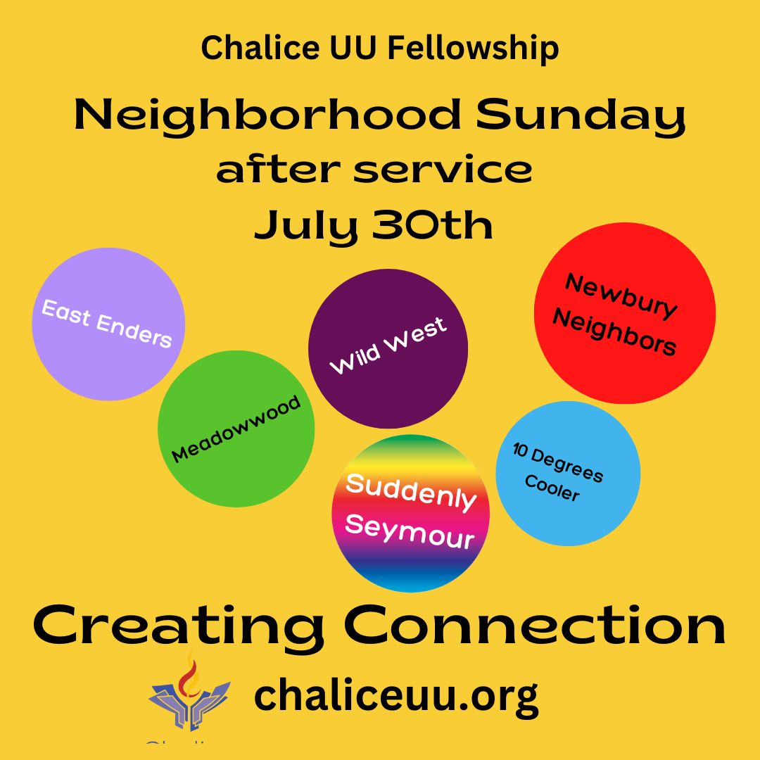 It is a great opportunity to spend time with Chalice members and friends who live near you and to get to know each other in a smaller group setting. Our services end around 11:15 or 11:30 am so grab a cup of coffee and create connection!