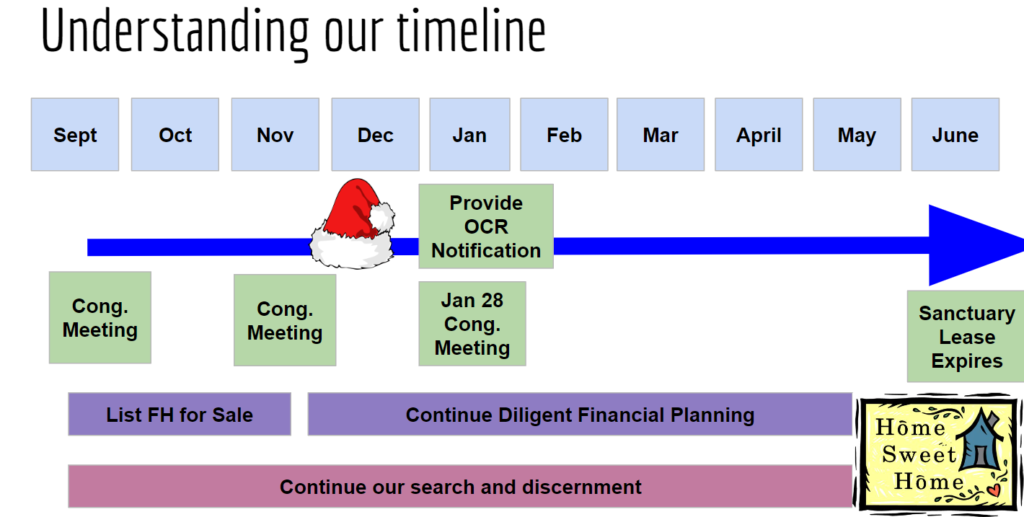 Our lease continues until June 30 for the Sanctuary, so we will continue to worship there until that time. Meanwhile, we are working on finding space to lease, either at the United Methodist Church of Westlake Village or somewhere else. This would be a temporary move, if we haven’t found another location to buy by then. We are still in negotiations with UMCWV, but in principle, they are open to sharing space with us and hold similar justice perspectives. Also, we are very experienced at online services, after 2 years of doing that during COVID. So we always have that option temporarily, or to meet in a park. Meanwhile, we are continuing our active search for places and land to buy.